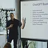 Fra det filosofiske og eksistensielle, til det mer konkrete. Neste del av frokosten handlet om hvordan vi faktisk får KI til å jobbe for oss. Strategisk rådgiver i Trigger, Knut Sverre, tok deltakerne med inn i byråets KI-infrastruktur, bygget på ChatGPT Business, sammen med Triggers seniorrådgiver for teknologi og KI, Fredrik Myhre.